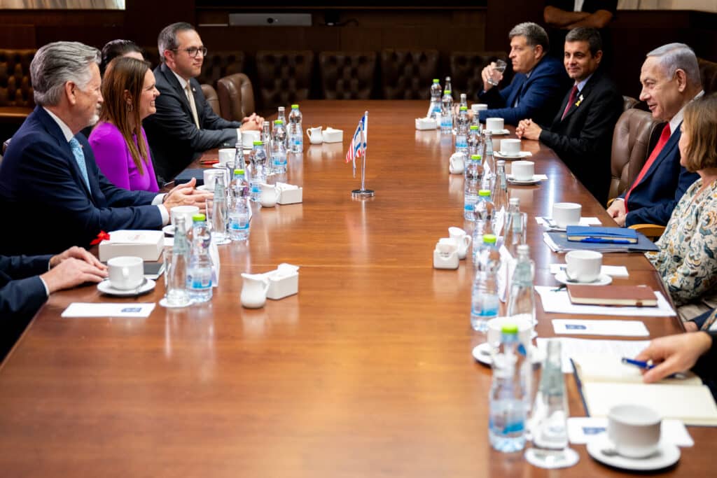 “Governor Sanders met with Israeli Prime Minister Benjamin Netanyahu today to discuss Arkansas’ unbreakable bond with Israel and commitment to standing with the Israeli people to defeat common enemies and defend shared values. The Governor emphasized the steps her administration has taken to support Israel, including Arkansas’ recent decision to invest up to $50 million in state retirement funds in Israeli bonds, in addition to the $55 million already held by the Arkansas Treasury, and requiring state government to accurately refer to Judea and Samaria when discussing the region west of the Jordan River. Components of Israel’s Iron Dome are produced in Arkansas, and the Governor expressed interest in expanding that partnership to support both Arkansas’ economy and Israel’s national security. Governor Sanders invited the Prime Minister to visit Arkansas, and the Prime Minister indicated his interest in the proposal.